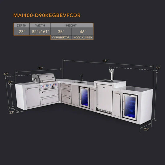 Mont Alpi 400 Deluxe BBQ Grill Island with L-Shape, Kegerator & Fridge Cabinet - MAi400-D90KEGFC