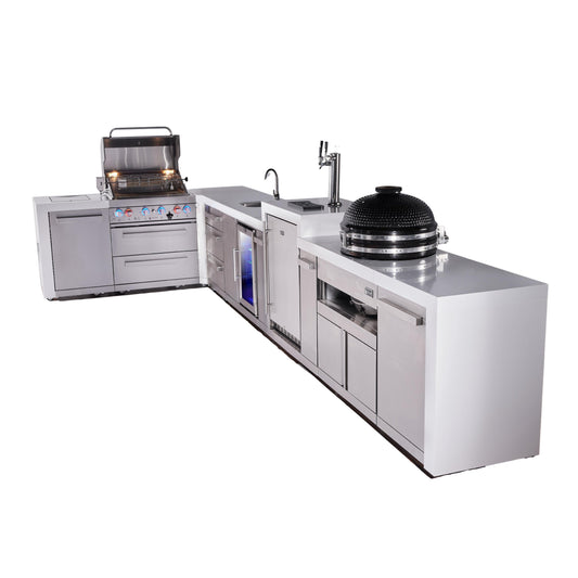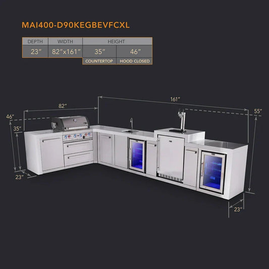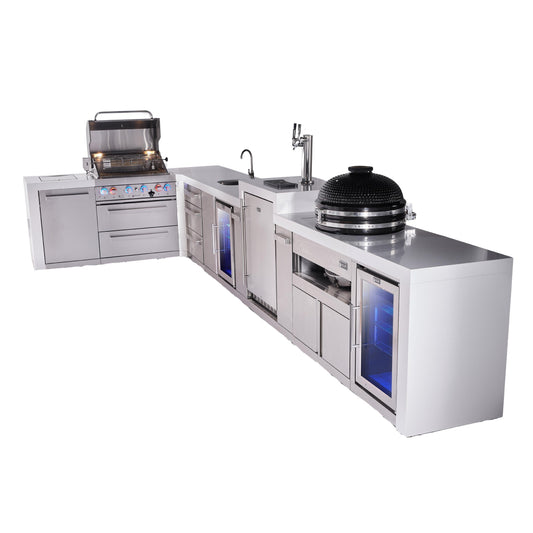 Mont Alpi 400 Deluxe BBQ Grill Island with L-Shape, Kegerator, Kamado Module & Extra Storage - MAi400-D90KEGKAMXL