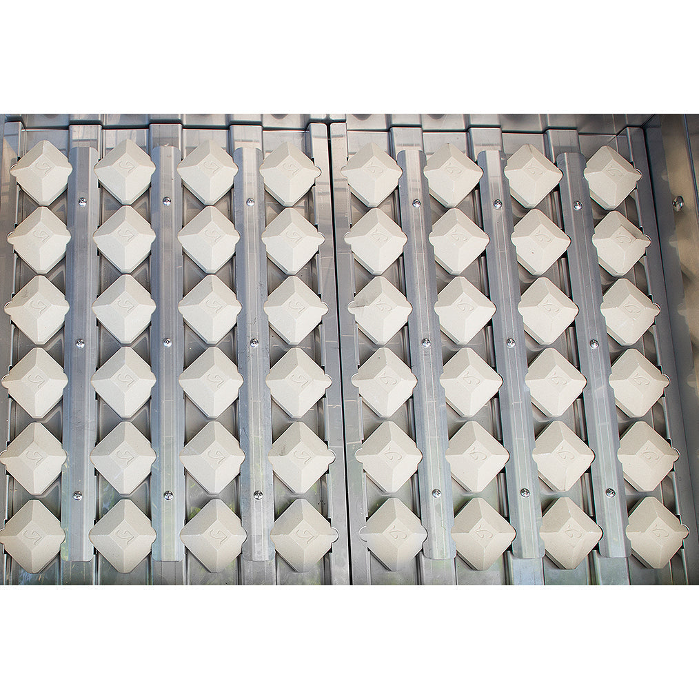 Refractive ceramic 5-way heat distributing briquettes eliminate hot and cold spots, making the effective grilling area 100% of the grilling surface. High-density composite material in a flat top pyramid-shape, with a heat-holding cavity underneath, delivers intense heat to the cooking surface.