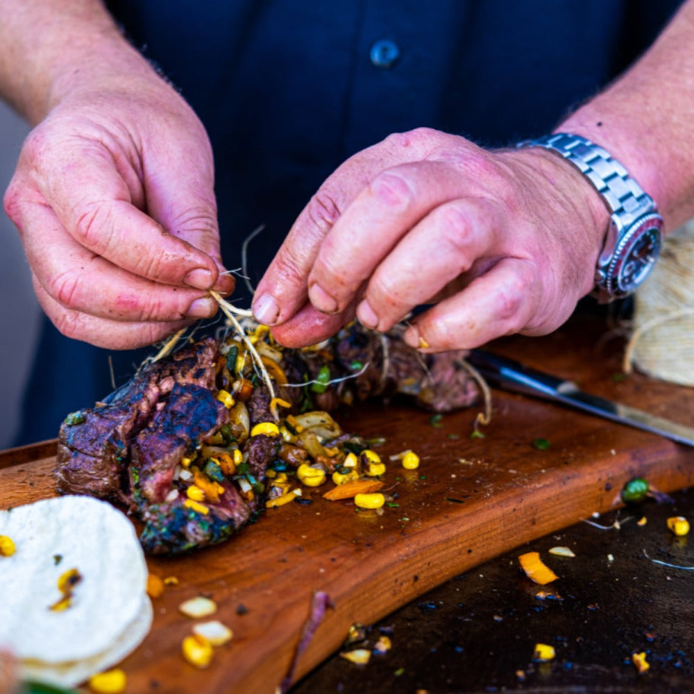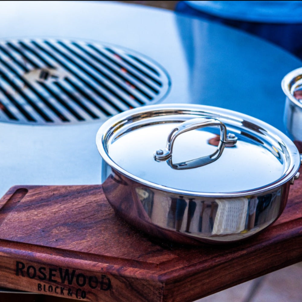 The curvature perfectly compliments the Arteflame cooktop of the 30" and 40" grills. Other features include a 5/8” juice groove and feet for stability.