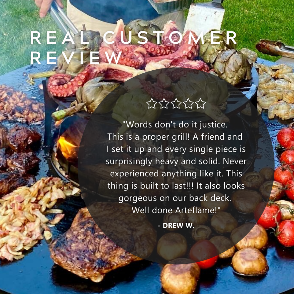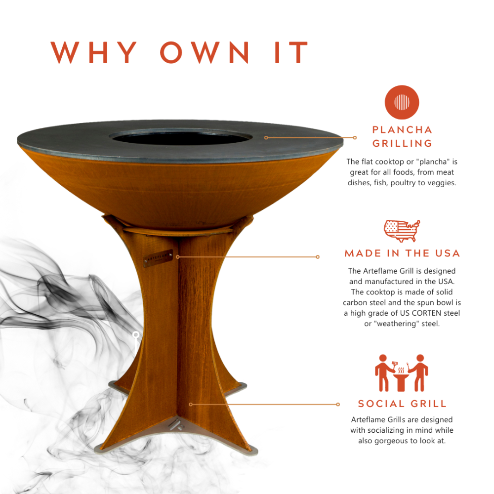 The Arteflame Euro 40" grill is a one of a kind grilling experience. The cooktop is made of extra thick carbon steel and the spun bowl is high grade US CORTEN steel or "weathering" steel.