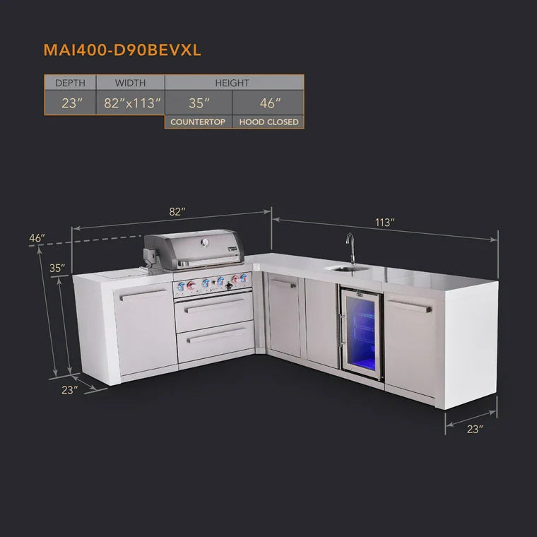Mont Alpi 400 Deluxe BBQ Grill Island with L-Shape, Beverage Center & Extra Storage - MAi400-D90BEVXL