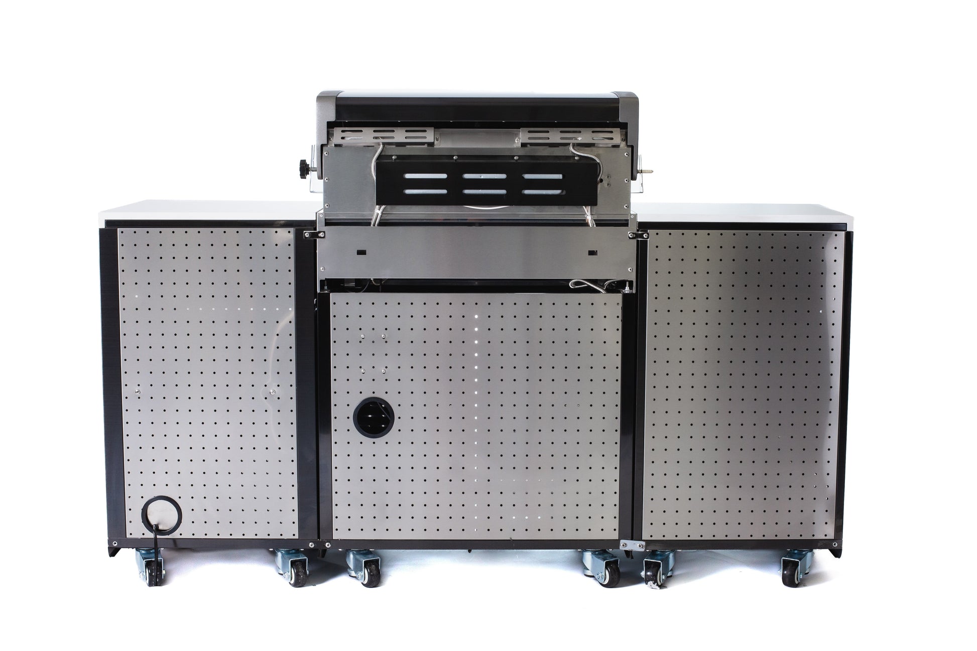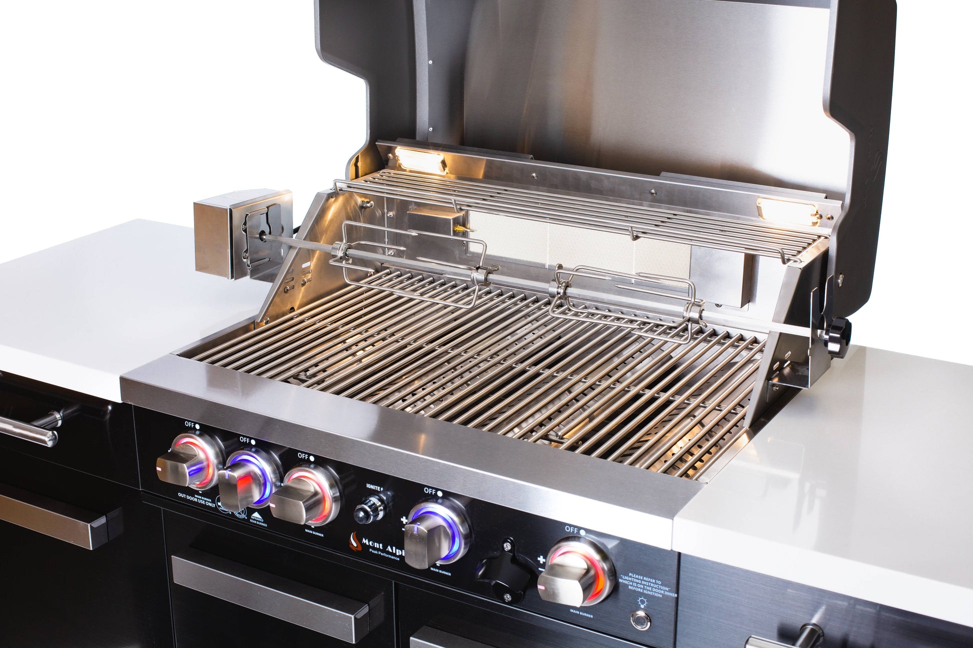 The grill comes standard with LED knobs that are blue when the grill is off and red when the grill is on, there are also two bright internal lights for precision cooking, even in the dark.