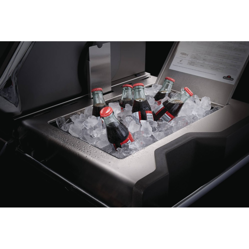- Large side shelves provide prep and staging space, while protecting the infrared sear station. The right side shelf hides an integrated ice bucket and cutting board allowing more prep space while keeping the chef and guests hydrated