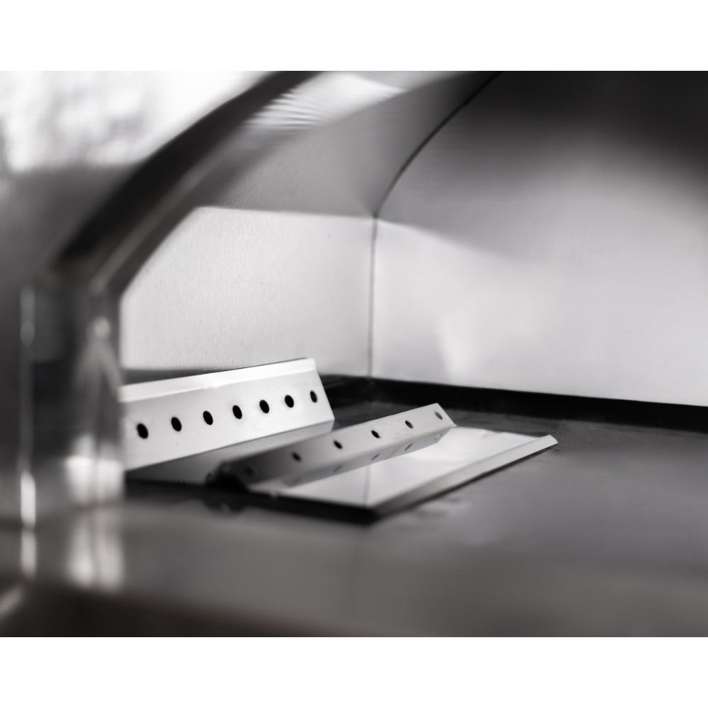 The ceramic insulated, dual-wall stainless steel Pizzero quickly reaches the temperatures necessary to sear toppings and seal in the moisture of the dough yielding soft yet char-blistered crust. Its heat-refracting ceramic cooking floor measuring 34” x 29” can accommodate pizzas as large as 19 inches in diameter.